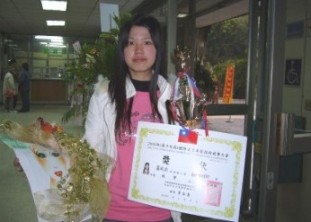 一開始排斥參加比賽、到接受、到努力練習、到得獎,我才發現,『天下無難事,只怕有心人』,只要有心,沒有什麼辦不到的事情,只要肯努力肯吃苦,就會成功。這次得到的這個獎,並不是我一個人獲得的,那是老師及同學甚至是家人一起得到的,因為有他們的掌聲,才使我不斷的努力向上、勇往直前邁進。 希望未來有機會參加各項活動及比賽的學弟妹們,要對自己有信心,機會來臨時,就要努力去爭取表現。當用自己雙手,一點一滴的辛苦創作出來的作品得獎時,除了很開心,還有一個字,那就是『棒』!這個棒,是自己體會到而別人無法了解的,每個失敗或是成功的經驗,都是自己珍貴的收穫,是無法用金錢買到的。 |
